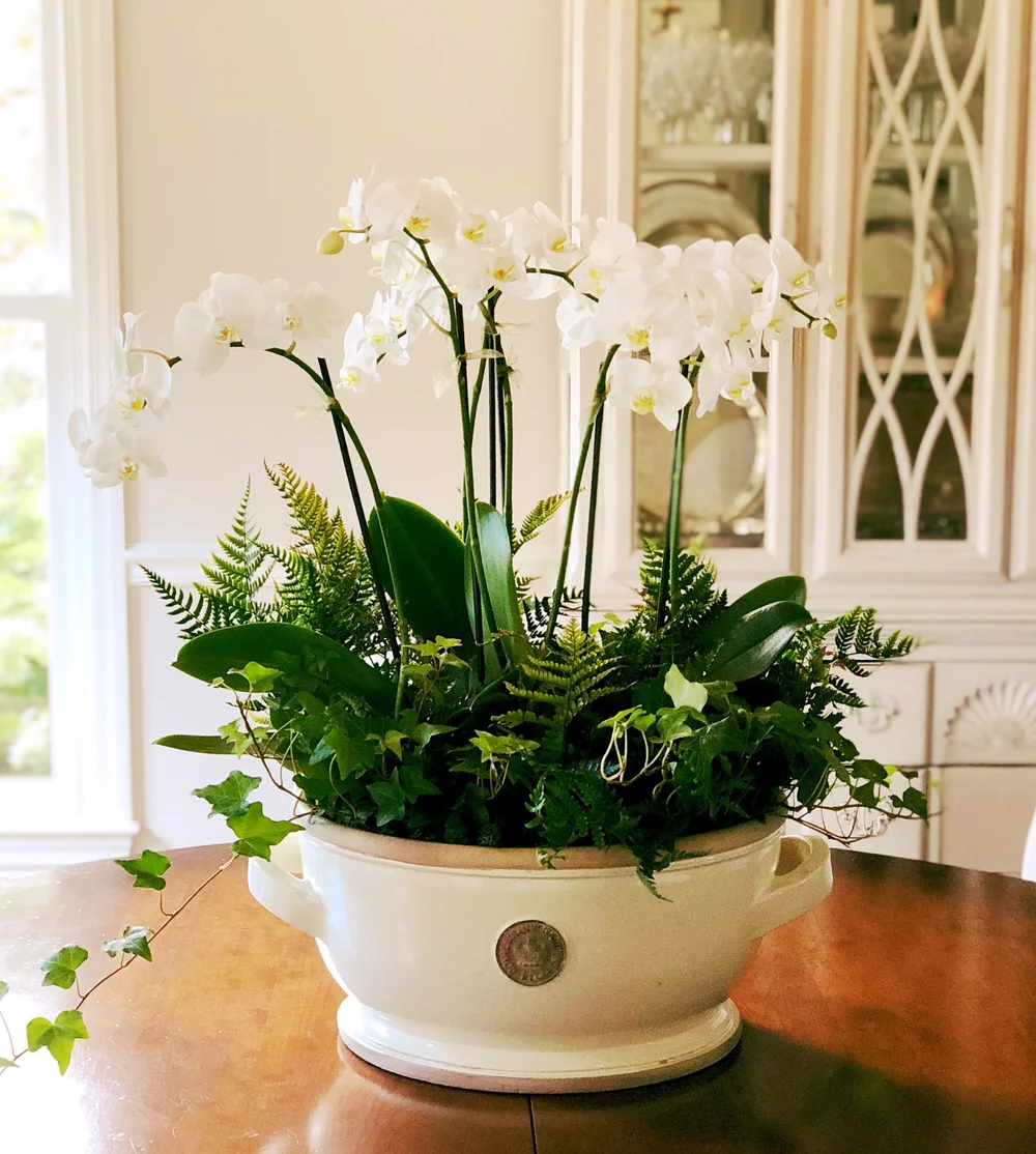I love peachy yarrow, golden ferns, blooming jasmine or clematis, white spirea, or dark foliage like begonia or huechera for this effect.